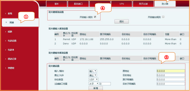 方法一,設(shè)置防火墻規(guī)則。在網(wǎng)頁中登錄話機(jī),選擇“網(wǎng)絡(luò)” -- “防火墻” –“防火墻設(shè)置”, “輸入/輸出”選擇輸入,“禁止/允許”選擇允許,“協(xié)議類型”默認(rèn),“過濾端口范圍”大于 0,“源地址”填服務(wù)器地址,“源子網(wǎng)掩碼”填服務(wù)器 IP 對應(yīng)的掩碼,點(diǎn)擊“新增”,在“防火墻規(guī)則設(shè)置”勾選“開啟輸入規(guī)則”,提交。